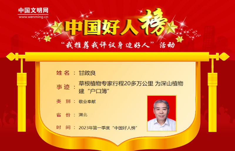 甘啟良是湖北省十堰市竹溪县啟良植物研究所负责人,他开展植物资源普查与研究24年,踏遍竹溪群山万壑,行程20多万公里,奠定了地方植物志编写范式,为保护生物多样性作出突出贡献。